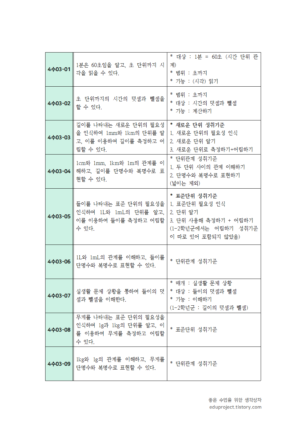c. 시간, 길이, 들이, 무게의 단위를 지도할 때 단위 사이의 관계를 이해하는 데 중점을 두고, 지나친 단위 환산은 다루지 않는다.