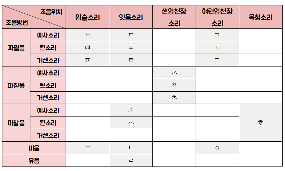 조음방법은 세로에 놓아 공부합니다. 두 요소에 해당하는 자음이 무엇인지 공부해봅시다.