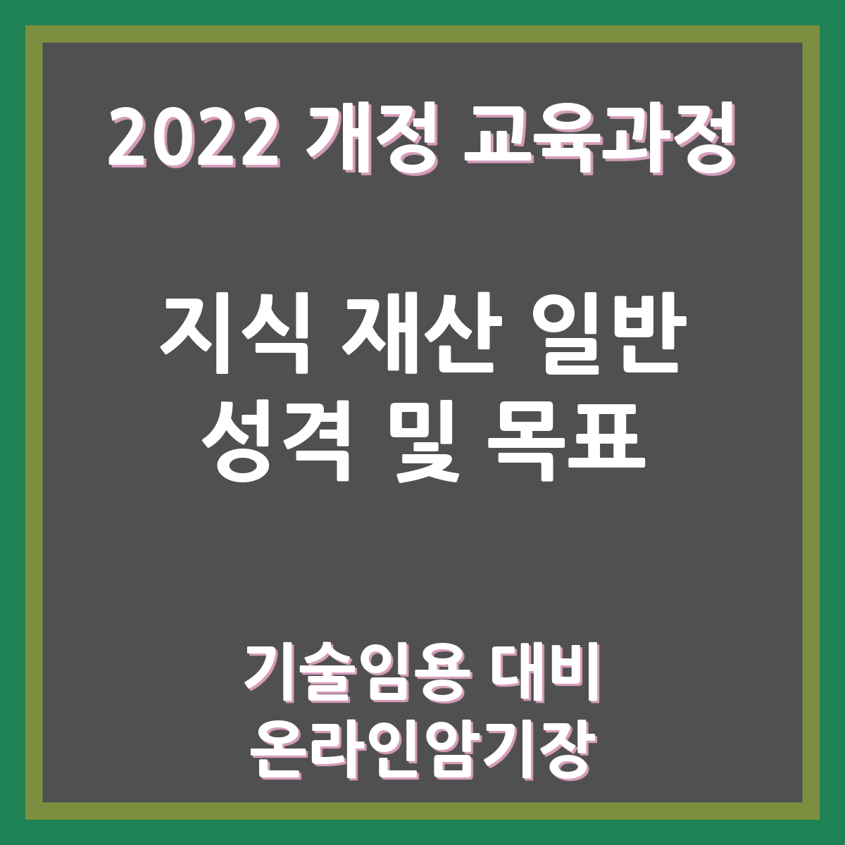 '지식 재산 일반'은 발명과 지식재산에 관한 실제적이고 흥미로운 사례를 탐구하고 문제를 해결하며, 지식재산 프로젝트 활동을 통하여 지식재산 관련 분야의 진로를 탐색하도록 설정된 과목으로서 지식재산 소양 함양과 지식재산에 관한 문제해결능력을 기르는 데 목적이 있다.