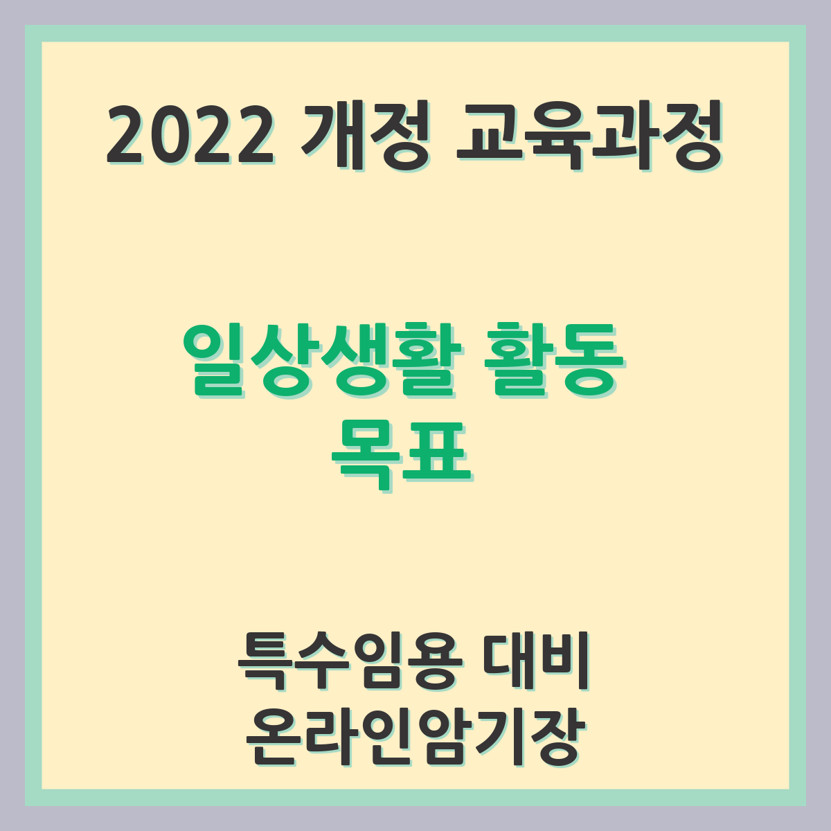 | 일상생활 활동 활동의 주안점과 예시 온라인암기장 | 2022개정 교육과정 특수 임용 대비 (1) | 2025.11.07 |